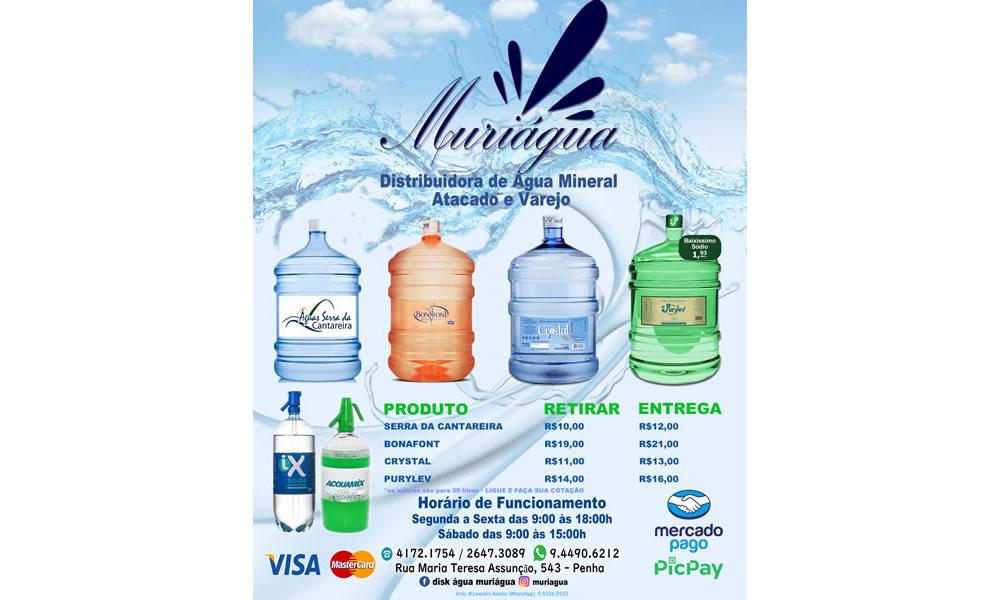 Mini catálogo de produtos de uma distribuidora de água da região da Penha em São Paulo, frente-verso com seus respectivos valores atualizados constantemente, horário de funcionamento, endereço e telefones / celulares para agendamento de pedidos para entrega. Produzido com Fireworks e Photoshop.
